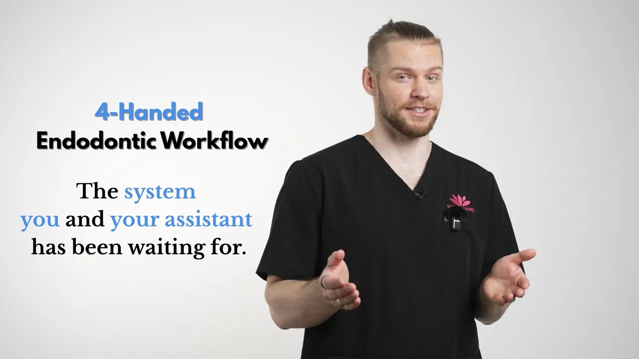 Desk to desk. Every step defined. Desk talk → RVG → dam → access → shaping → irrigation → obturation → restoration → close. You leave with your own written version.